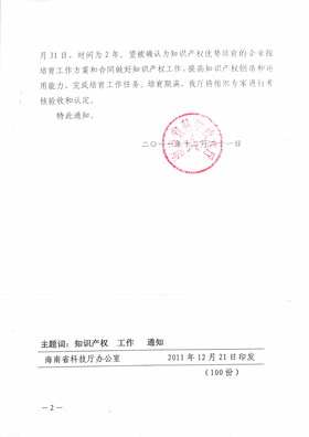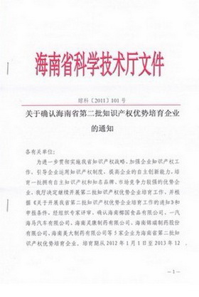 公司成为海南省第二批知识产权优势培育企业