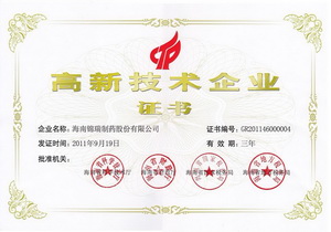 2011年9月19日,海南锦瑞制药股份有限公司获得高新技术企业证书。