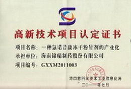 我公司“一种高溶解度、高稳定性的氯诺昔康冻干粉针剂”项目获得海南省高新技术项目证书。