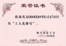 近日,海口市总工会召开2011年度先进集体和先进个人表彰大会,表彰了在争创以“一流工作、一流服务、一流业绩、一流团队”为主要内容的“工人先锋号”活动中,成绩显著、贡献突出的先进集体;海南锦瑞制药股份有限公司生产技术部五车间经过层层评选,被授予此项荣誉。