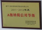 近日,海南省国家税务局、海南省地方税务局联合授予海南锦瑞制药股份有限公司“2011-2012年度A级纳税信用等级”荣誉称号。