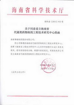 日前,经专家组验收合格,海南省科技厅批准海南锦瑞制药股份有限公司设立海南省代谢类药物制剂工程技术研究中心。
