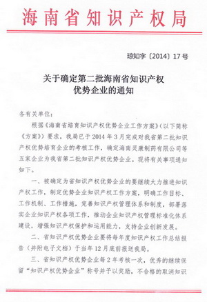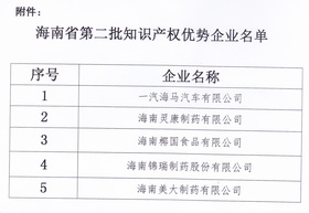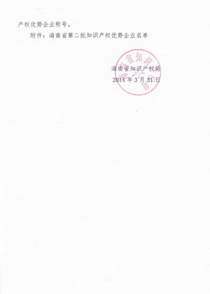 日通过考核,被确定为第二批海南省知识产权优势企。
