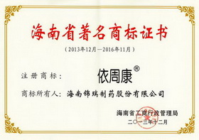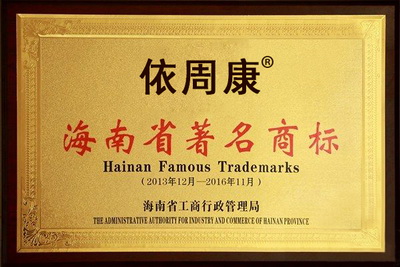 经海南省著名商标审核委员会审核,我公司“依周康”商标被海南省工商行政管理局认定为2013年海南省著名商标。