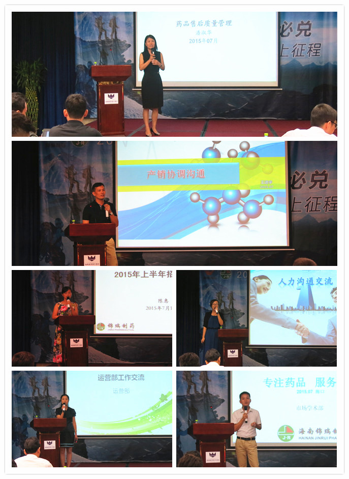 丰盛的午餐过后,是厂部各个部门与销售体系的交流会。质量体系潘淑华副总进行质量关键信息的对接,生产体系王进宇副总进行生产相关业务的交流,招标事务部、行政人事部、运营部、市场学术部均就2015年上半年度工作做了一次全面的沟通和交流。会议持续至下午18点30分,至此海南锦瑞制药2015年营销半年会圆满结束。