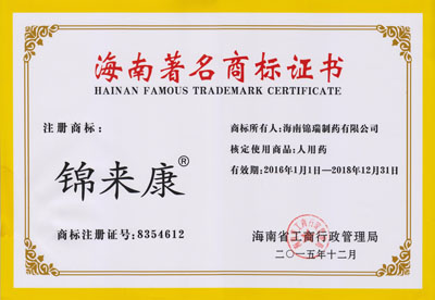 经海南省工商行政管理局评选认定,公司“锦来康“商标被认定为