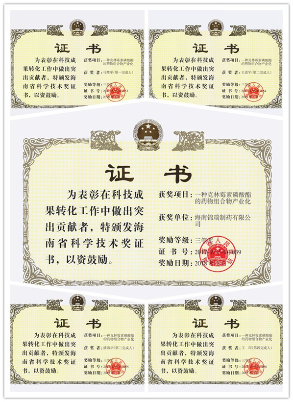 近期,安博手机获得了海南省人民政府颁发的“一种克林霉素磷酸酯的药物组合物产业化”科技成果转化三等奖,并表彰了在该科技项目成果转化工作中做出突出贡献者:马鹰军、王进宇、潘淑华、王印。