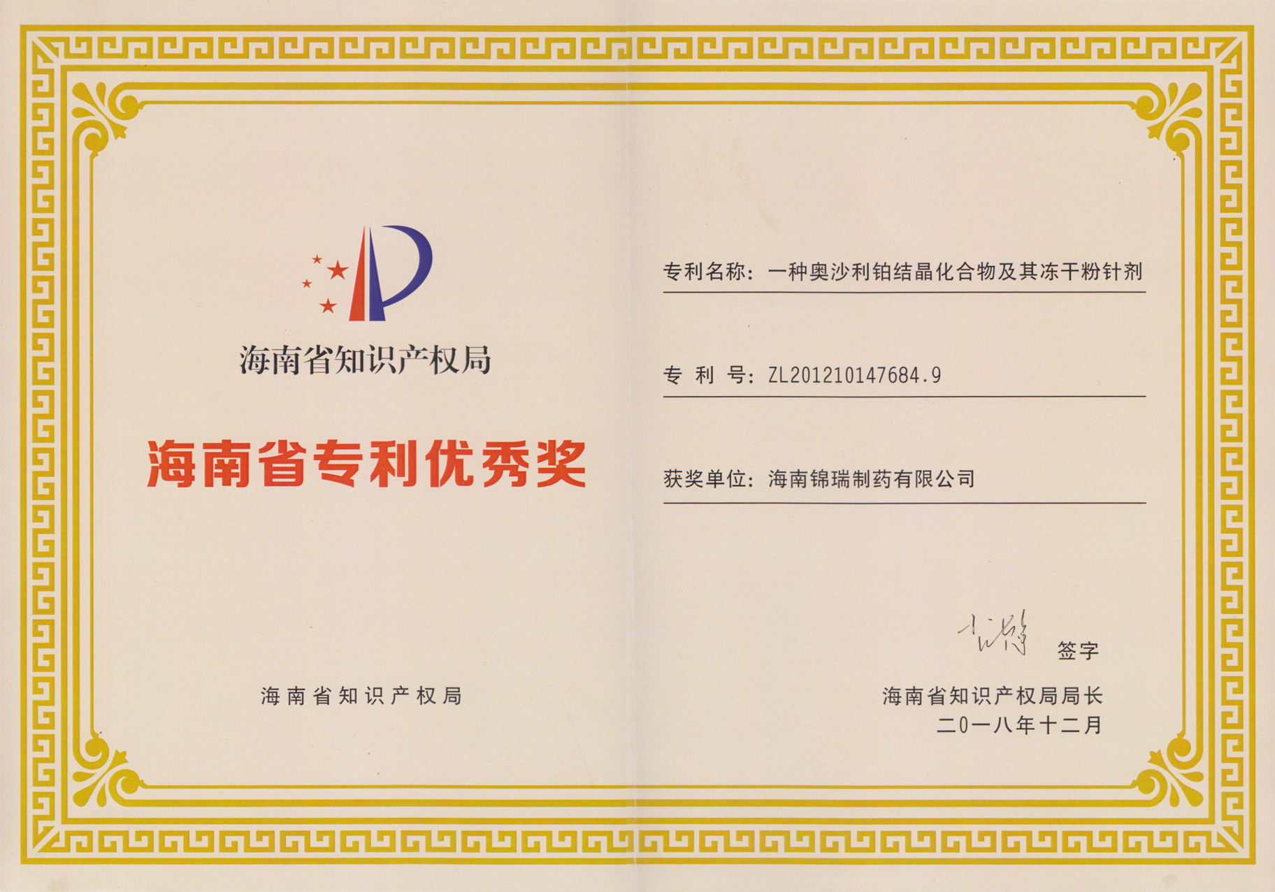 海南锦瑞一种奥沙利铂结晶化合物及其冻干粉针剂(专利号:ZL201210147684.9)荣获此次专利活动优秀奖。