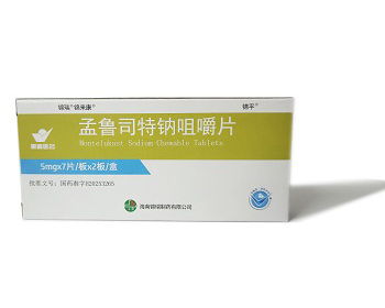 【药品名称】通用名称:孟鲁司特钠咀嚼片英文名称:Montelukast Sodium Chewable Tablets汉语拼音:Menglusitena Jujuepian【成份】本品主要成份为孟鲁司特钠。化学名称:[R-(E)] -1-[[[1-[3-[2-(7-氯-2-喹啉)乙烯基]苯基]-3-[2-(1-羟基-1-甲基乙基)苯基]丙基]硫]甲基]环丙烷乙酸钠。分子式:C35H35ClNNaO3S分子量:608.18辅 料:甘露醇、微晶纤维素、交联羧甲纤维素钠、羟丙纤维素、红氧化铁、阿司帕坦、樱桃粉末香精、硬脂酸镁【性状】本品为粉红色圆形片。【适应症】本品适用于2岁至14岁儿童哮喘的预防和长期治疗,包括预防白天和夜间的哮喘症状,治疗对阿司匹林敏感的哮喘患者以及预防运动诱发的支气管收缩。本品适用于减轻过敏性鼻炎引起的症状(2岁至14岁儿童的季节性过敏性鼻炎和常年性过敏性鼻炎)。【规 格】 5mg(按C35H36ClNO3S计)。