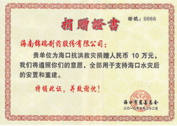 面对海南历史罕见的强降雨灾害,锦瑞制药股份有限公司积极参与捐款,密切关注灾情,与灾区人民心连心!做为一家初创期企业,公司仍坚持“积极践行社会责任、关注社会公益、饮水思源、回馈社会”的观念,充分体现了一个企业强烈的社会责任感。